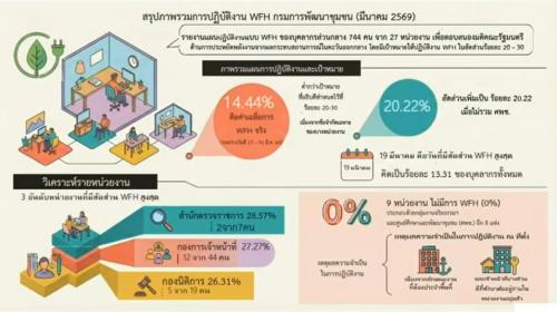 - ด้านการพัฒนาทรัพยากรบุคคล : ติดตามการขับเคลื่อนทุนสำหรับการเตรียมและพัฒนากำลังคนภาครัฐในระดับยุทธศาสตร์ ประจำปีงบประมาณ พ.ศ. 2568 พร้อมรับทราบรายงานผลการดำเนินงานโครงการพัฒนาข้าราชการที่อยู่ระหว่างทดลองปฏิบัติหน้าที่ราชการ รุ่นที่ 133 และสรุปภาพรวมการปฏิบัติงานในรูปแบบ Work From Home (WFH) ของกรมการพัฒนาชุมชน เพื่อเพิ่มประสิทธิภาพการทำงานให้สอดคล้องกับสถานการณ์ปัจจุบัน